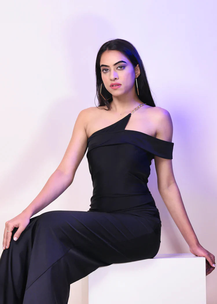 Black One Shoulder Slim Fit Dress – a captivating blend of style and classic allure. This long bodycon dress, crafted from high-quality polyester, boasts a solid pattern and one-shoulder style for a chic and timeless look. The slim fit and stretchable fabric ensure both comfort and sophistication. The unique touch of a rhinestone chain on the shoulder adds a touch of glamour. Sleeveless and featuring a subtle side slit, this dress is perfect for a date night, radiating elegance and charm in every step. Elevate your style and make a statement with this very stylish and classic piece.
