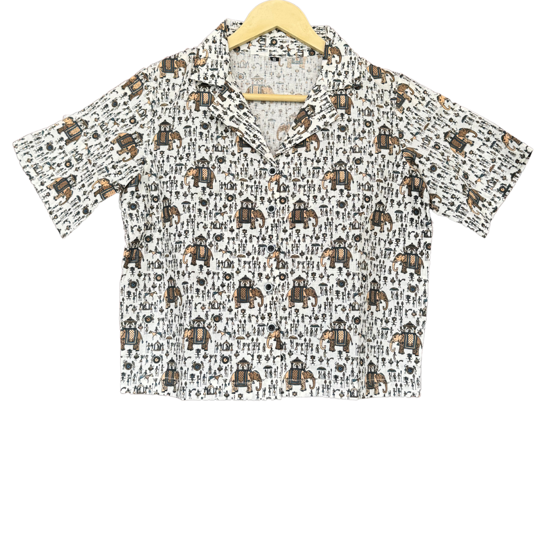 In the realm of fashion, where imagination paints the canvas of style, behold the captivating allure of the cream elephant print shirt. Pair it with denim jeans for a casual look or trouser while going to office.