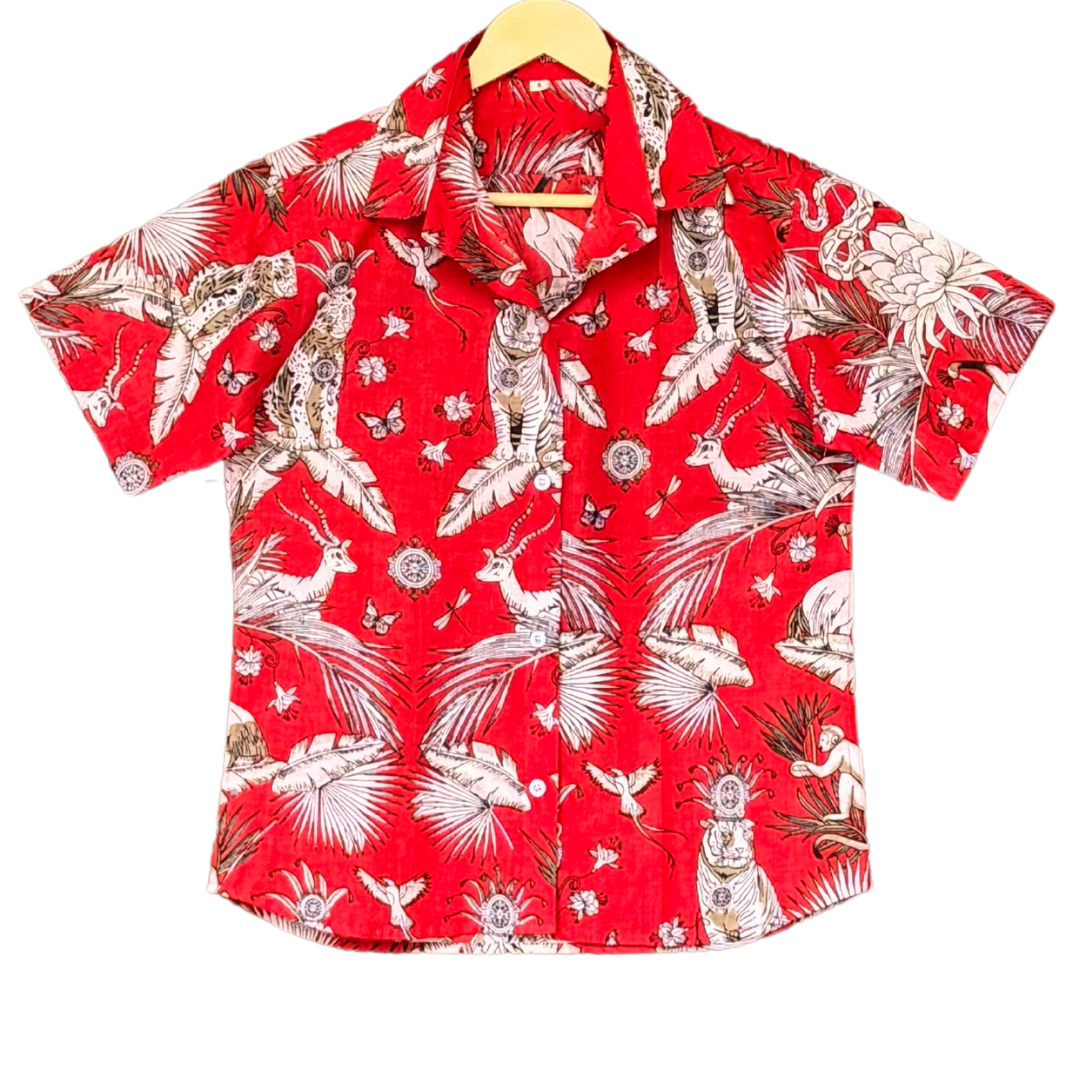 Step into the urban jungle with this geometric animal figures cotton print shirt, where art meets adventure. Its intricate patterns intertwine to form a mesmerizing display of wildlife in a modern context. Pair it with slim-fit jeans and sneakers for a casual day out, or layer it under a structured blazer for a daring twist on office attire. Let the fusion of geometric shapes and wild creatures ignite your imagination, as you roam the city streets with confidence and style. Embrace the boldness of nature reimagined, and make a statement that's uniquely yours