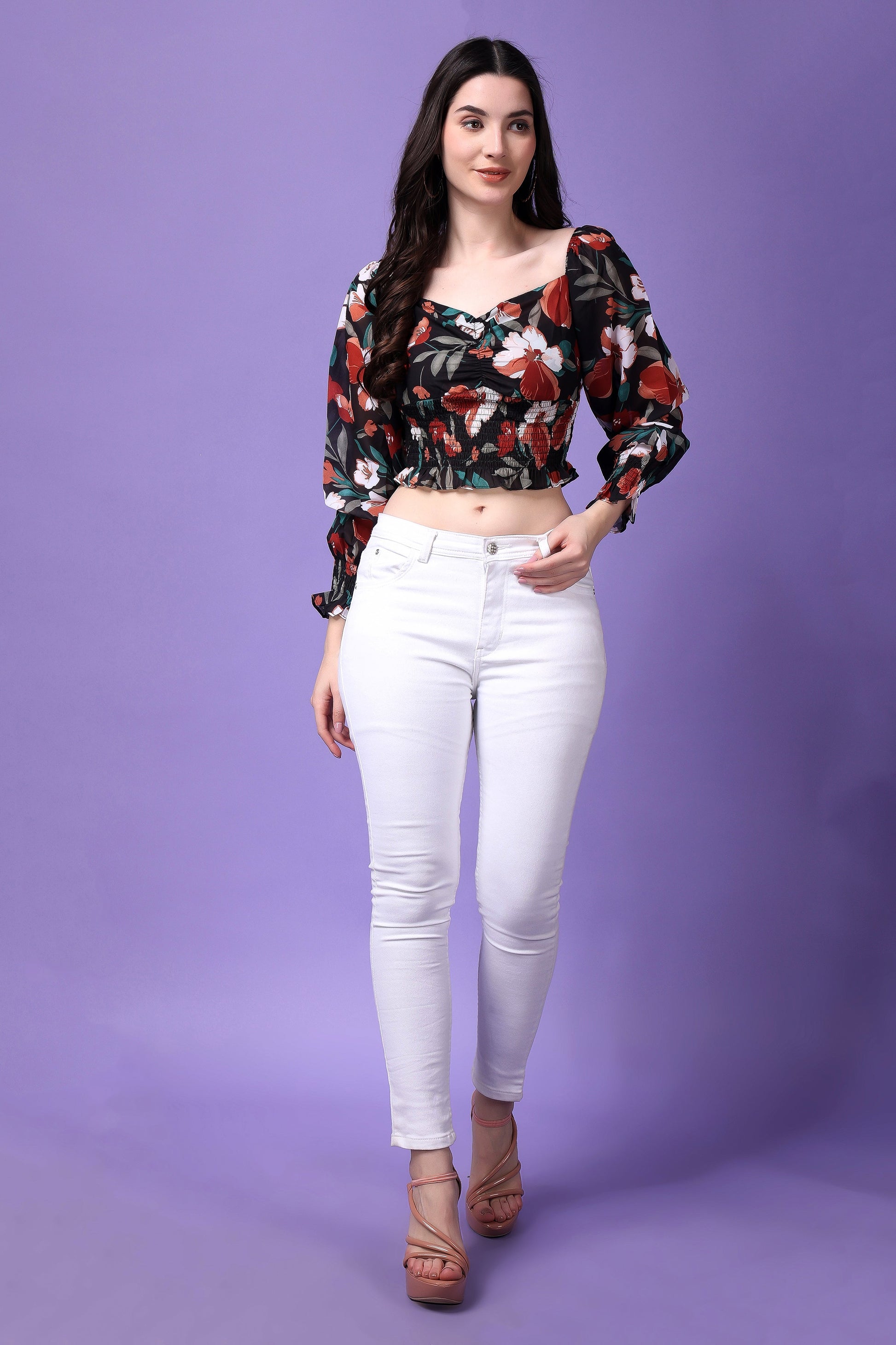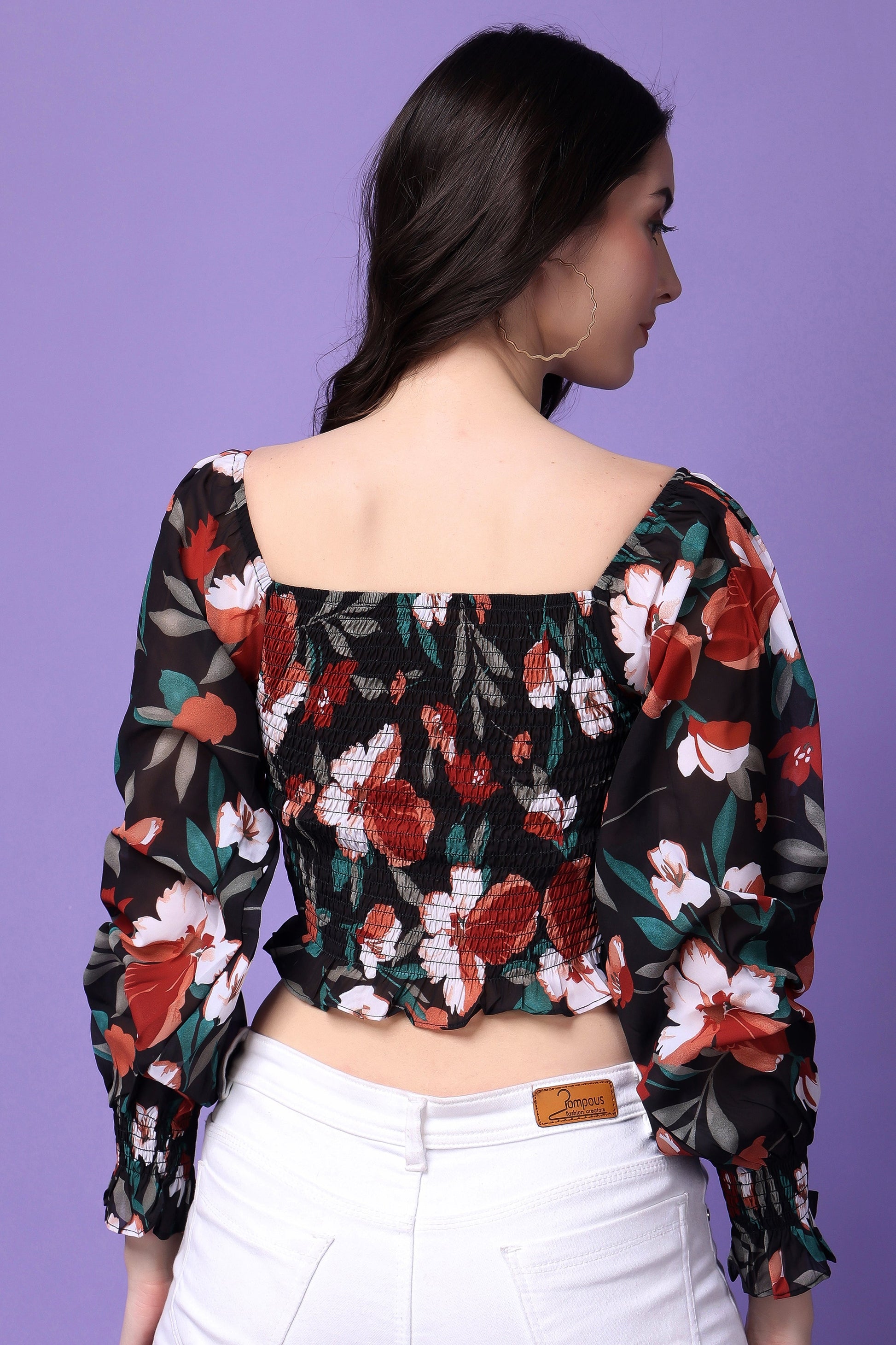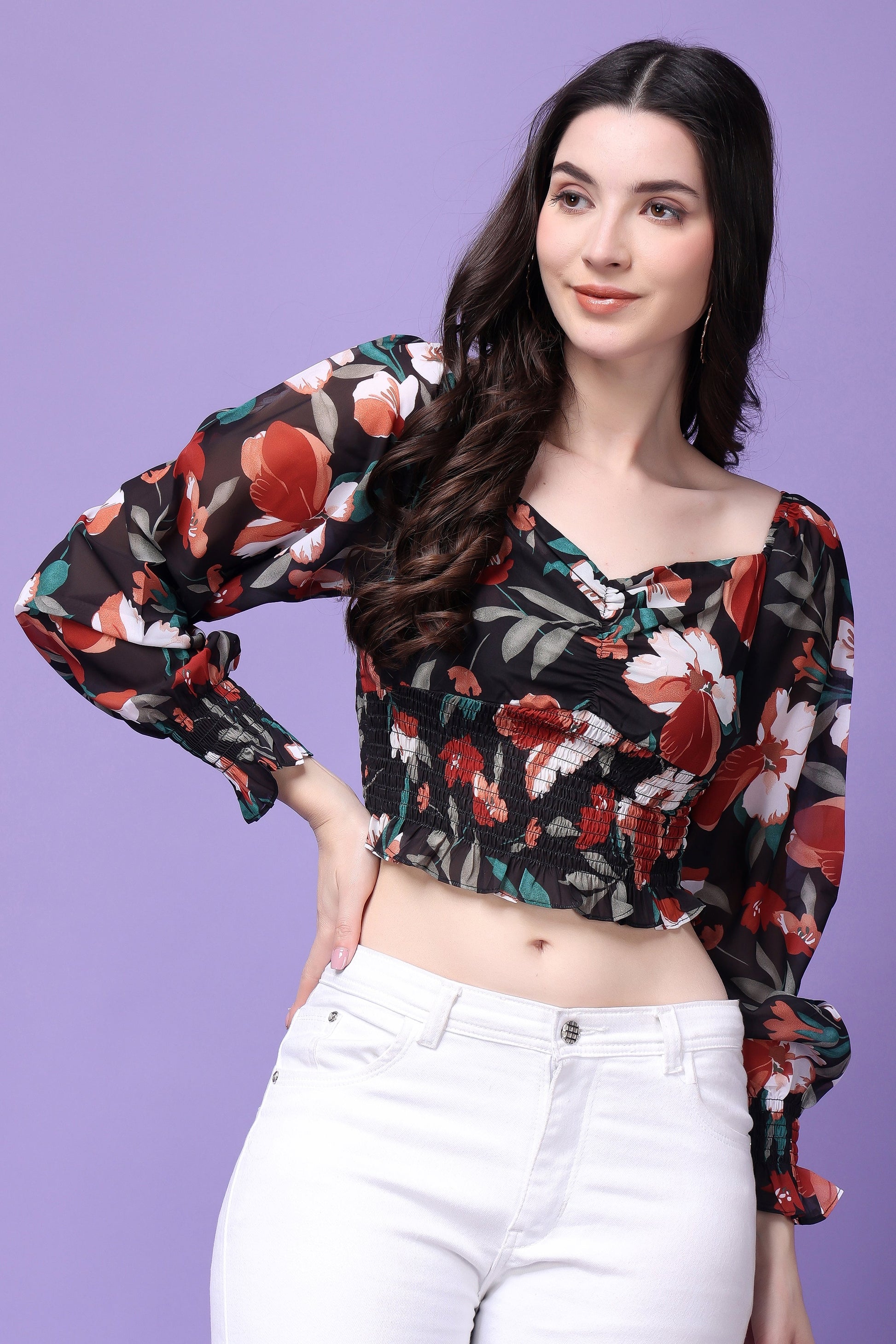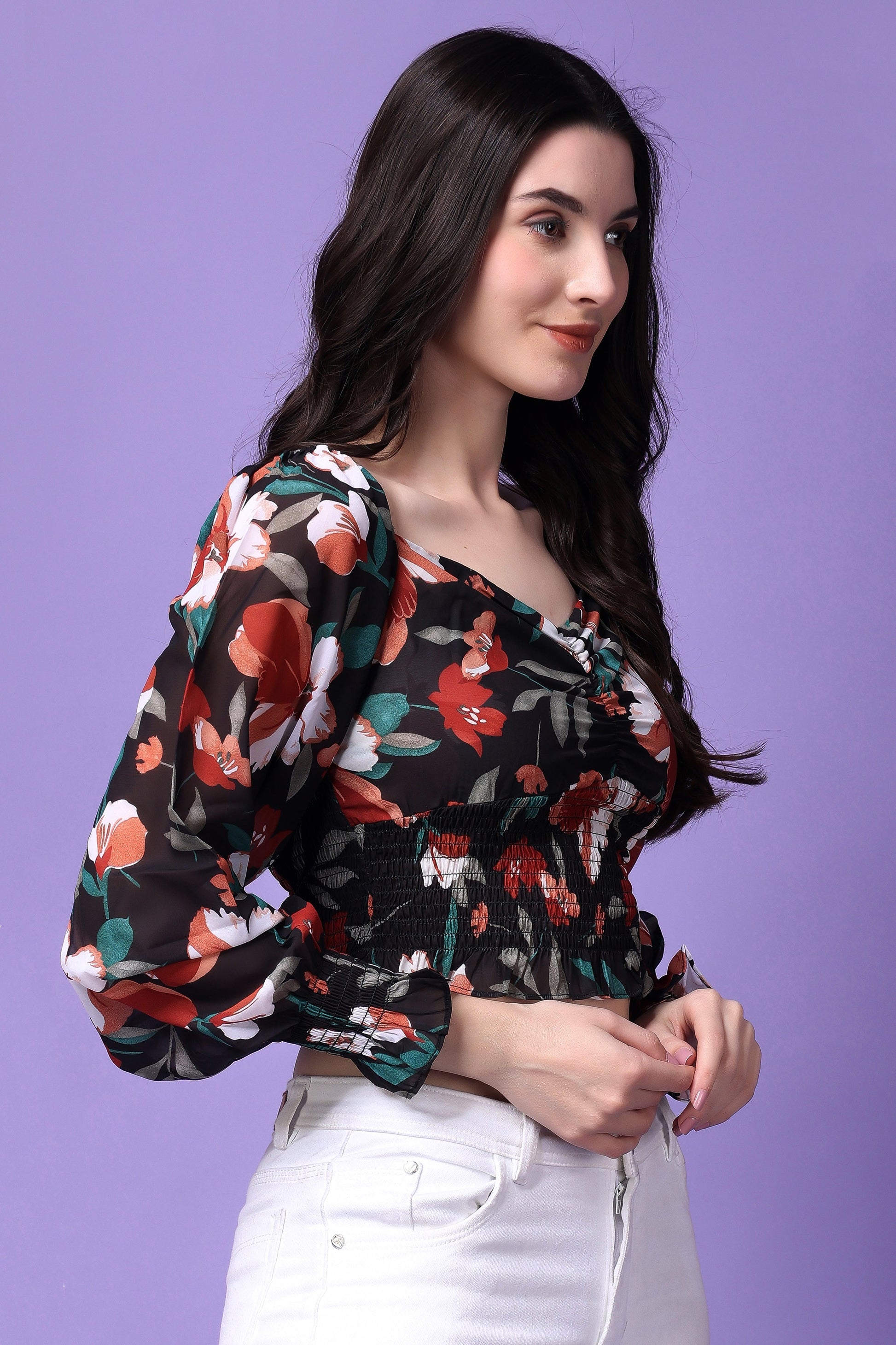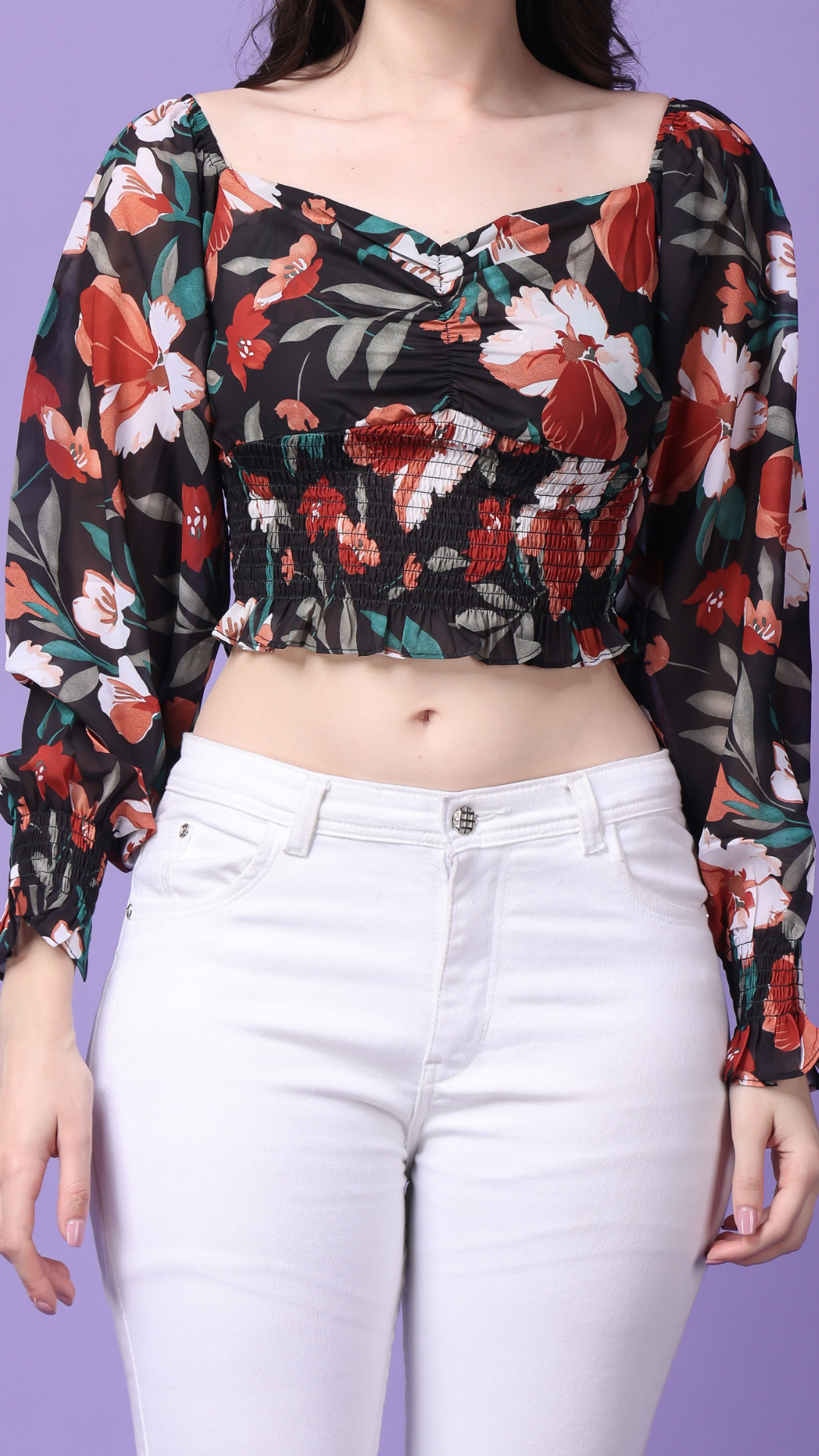 Indulge in a symphony of blooms with our mesmerising multicolour floral print balloon sleeve top, where every petal dances in harmony with your every move. With its whimsical design and voluminous sleeves, this piece captures the essence of playful femininity and joyful spontaneity. Each brushstroke of colour tells a story of blooming gardens and sun-drenched meadows, evoking a sense of endless summer days and carefree adventures. Pair it with your favourite denim for a casual yet captivating look, or elevate it with tailored trousers for a touch of sophisticated charm. Embrace the beauty of nature and let your style blossom with every wear