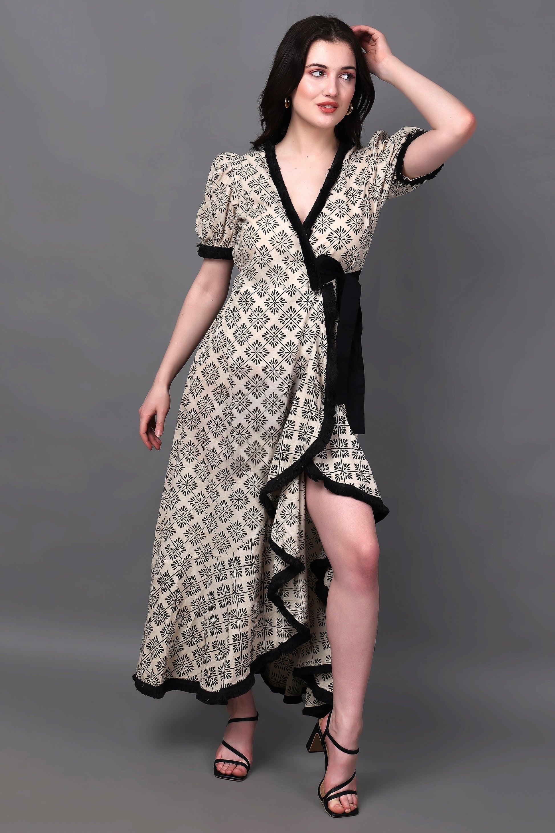 Step into the realm of contemporary chic with this geometric print wraparound dress, featuring a daring slit for an added touch of allure. Bold lines intersect and converge, creating a visual symphony that speaks to the modern muse within. The wraparound design accentuates your silhouette while offering a hint of flirtatious charm, making it perfect for both casual outings and evening affairs. Pair with sleek heels and statement jewelry for a sophisticated ensemble that commands attention, or layer with a denim jacket and boots for a more relaxed vibe. Let your style be the intersection of elegance and edge, where geometric precision meets effortless grace, leaving a trail of intrigue with every step